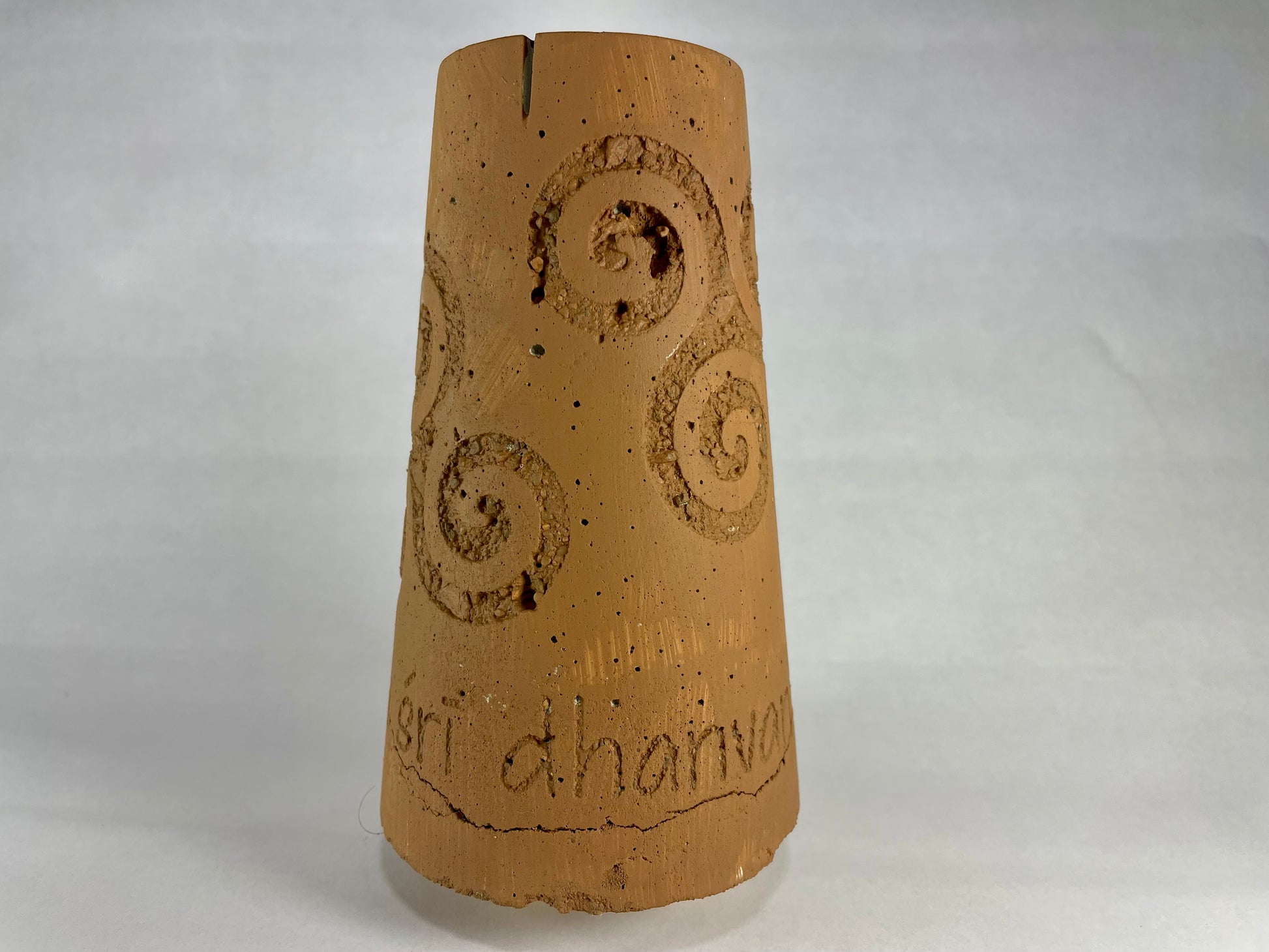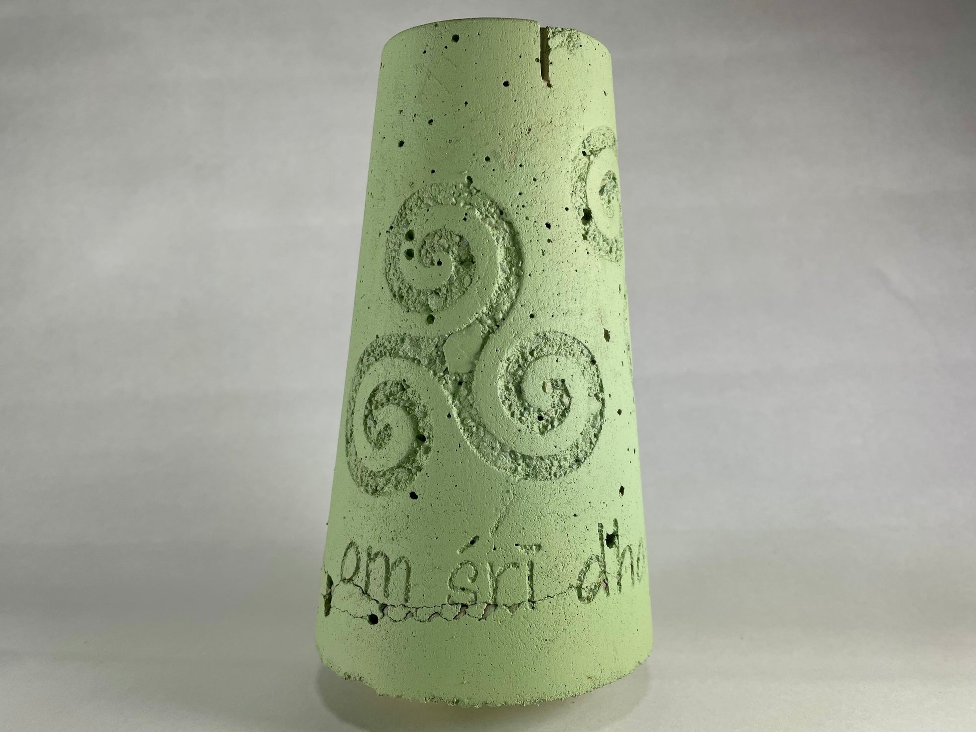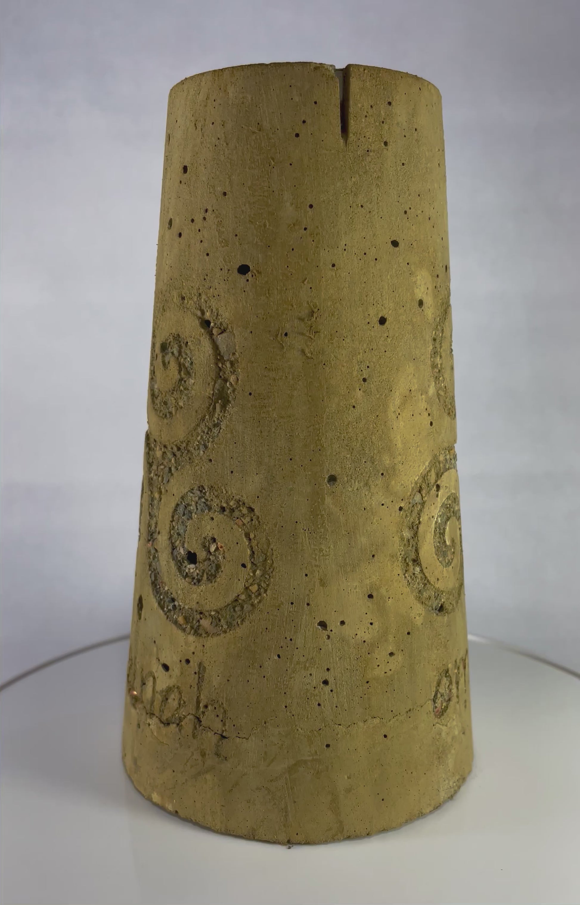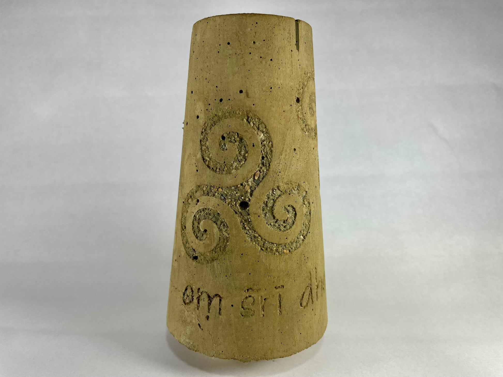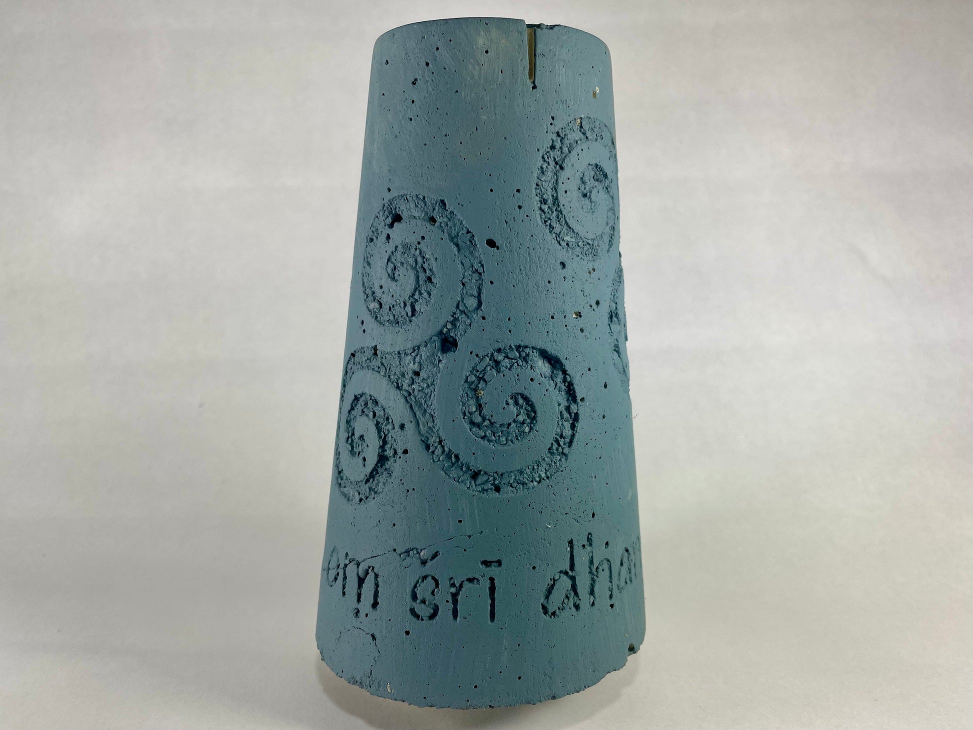 Made with a Sacred Feminine tensor ring, crushed quartz crystals, paramagnetic basalt rock dust, and Portland cement. Stained with a natural stain in dark earth brown, deep sky blue, sage (light turquoise), and natural sandalwood brown.